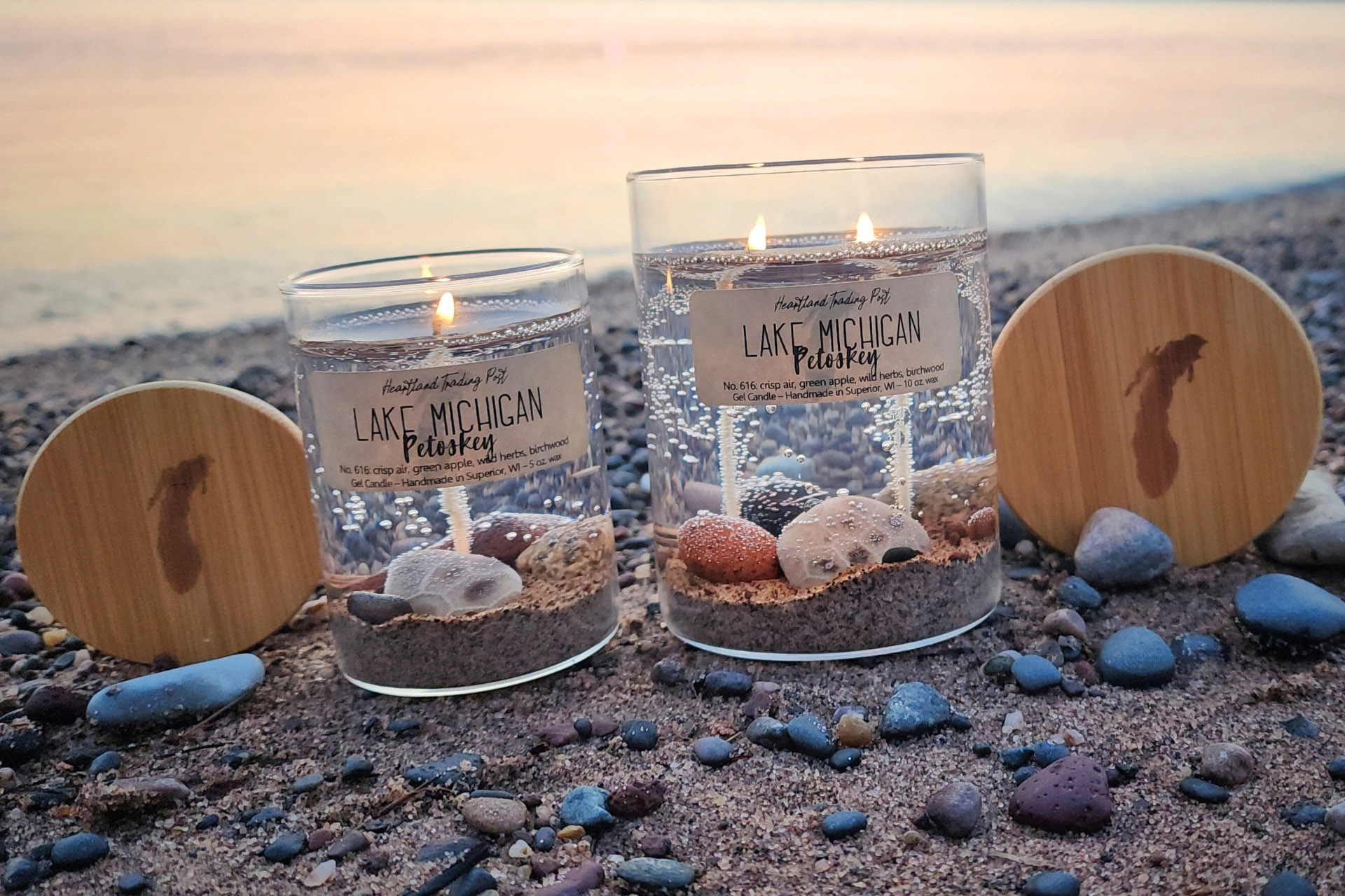 This candle features a base of lake sand and a variety of handpicked beach stones from the shores of Lake Michigan! Also featured in this candle is an authentic, natural Petoskey Stone!
